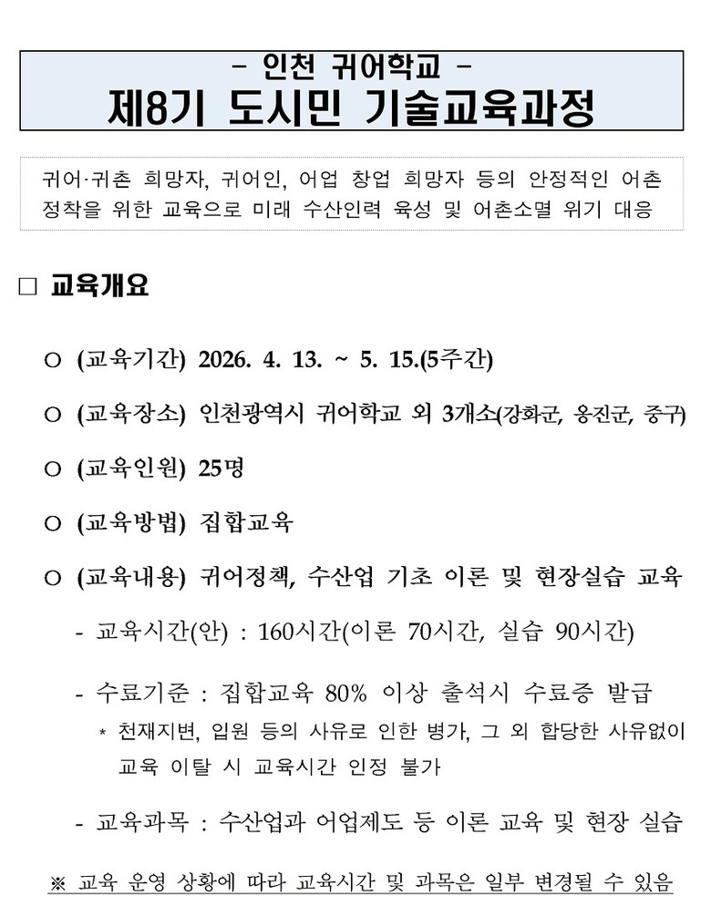인천시, 2026년 제8기 인천 귀어학교 입교 희망자 모집